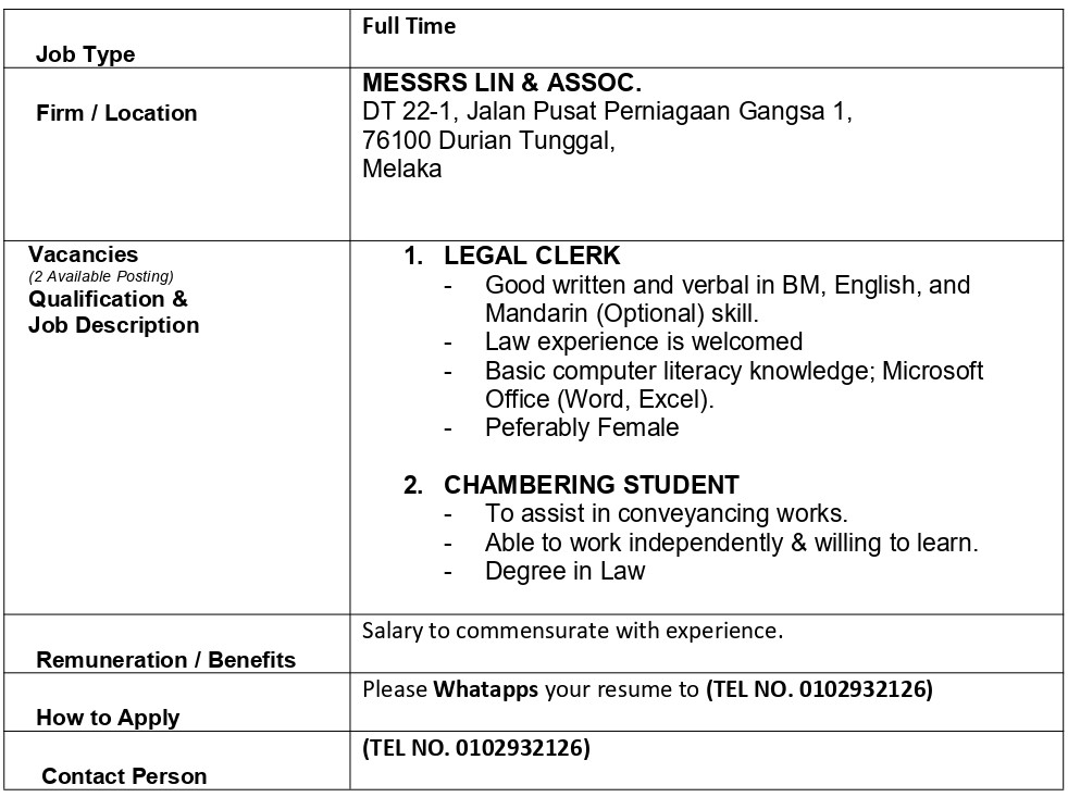 Malacca Bar Committee accepts advertisement for job vacancies in law firms for posting on the Malacca Bar website.